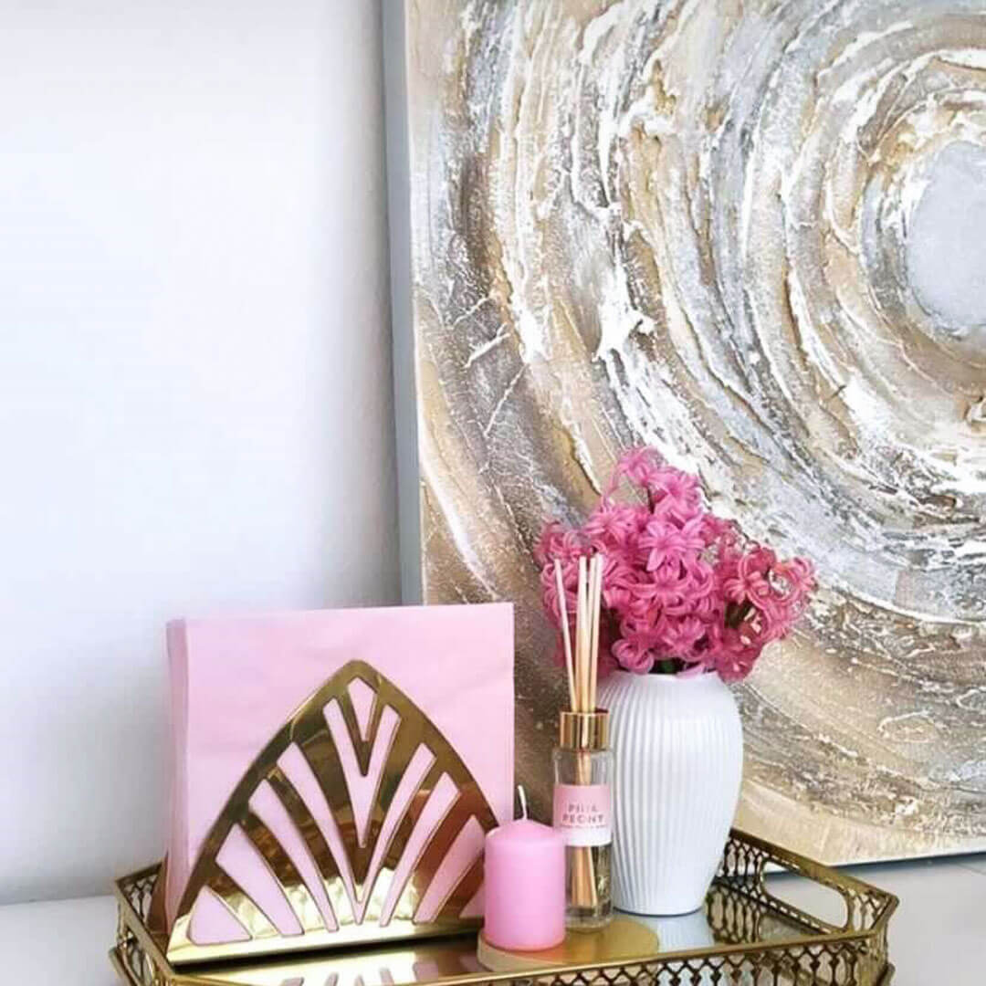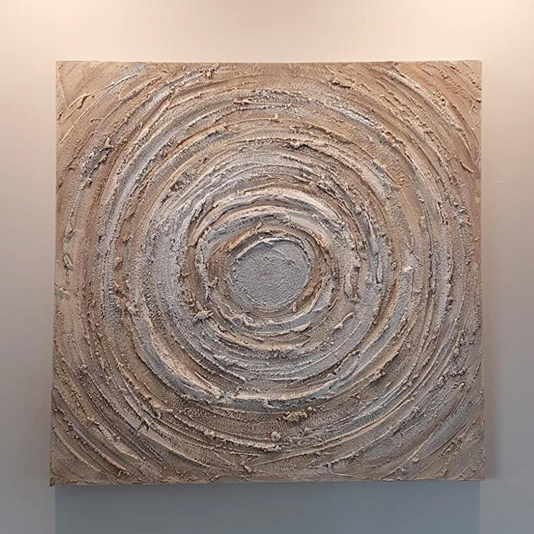 La pintura realizada a mano 'Ruddle Maelstrom' lleva al espectador a las profundidades de un vórtice abstracto que aparentemente nunca termina. El motivo atemporal está en tonos beis aplicados pastosamente y demuestra a cada uno de sus invitados su excelente gusto por el arte. En la pared de su salón, esta obra de arte, decorada con un brillo plateado, es tan excelente como en su oficina y le da al interior un toque nuevo y moderno.