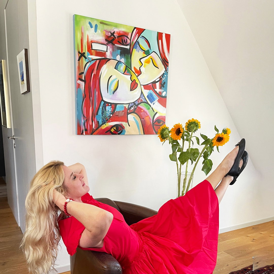 Bunte Pinselstriche formen auf dem handgemalten Acrylbild zwei sich liebkosende Figuren, die eine 'Lodernde Liaison' zu haben scheinen. Die Farbe der Liebe, Rot, intensiviert die sinnliche Ausstrahlung des mit mit Silberglanz verzierten Gemäldes und lenkt den Blick des Betrachters auf die Lippen der Personen, deren Mimik mit Raffinesse durch wenige Linien Ausdruck erhält.