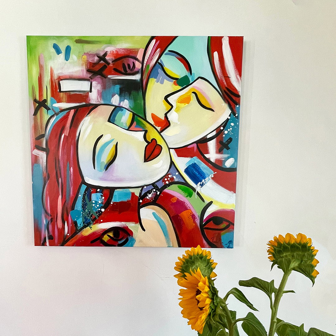En el cuadro acrílico pintado a mano, dos figuras parecen acariciarse con un 'Flaming Liaison'. El rojo domina el colorido del cuadro, adornado con un brillo plateado. Sus rasgos cubistas ponen acentos frescos en su salón y revelan a sus invitados su forma de entender el arte. Las pinceladas alrededor de los rostros oscilan entre el representacionismo y la abstracción, creando una imagen extraordinaria.