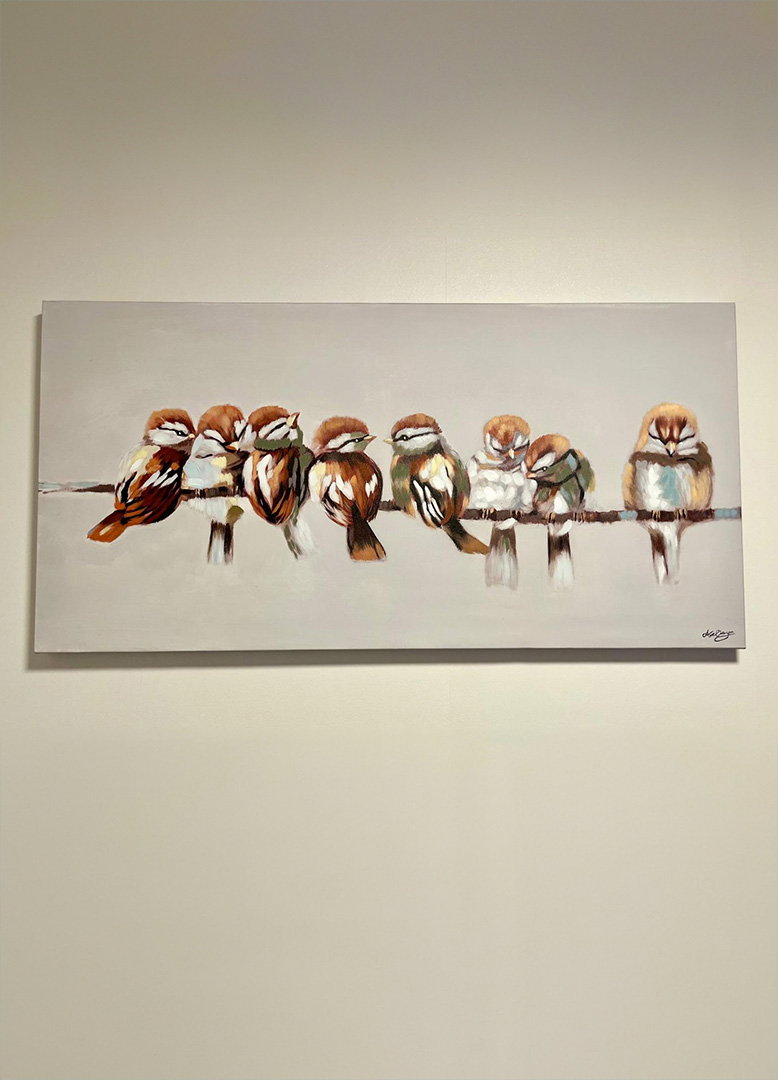 La 'Happy Family Reunion' de este cuadro en acrílico pintado a mano, muestra a unos encantadores gorriones con su plumaje rojo cobrizo. Estos pesos ligeros se acurrucan los unos junto a los otros y se sientan sobre la rama llenos de alegría por el reencuentro. El fondo de la obra es blanco para que la alegría familiar sea el centro de atención. Deje que los sentimientos positivos que desprende esta alada y alegre familia llenen su salón o su cocina y creen un ambiente familiar de manera sencilla y acompañado de una sensación de seguridad. Le garantizamos que todos los días tendrá espectadores con ojos emocionados ante esta obra.