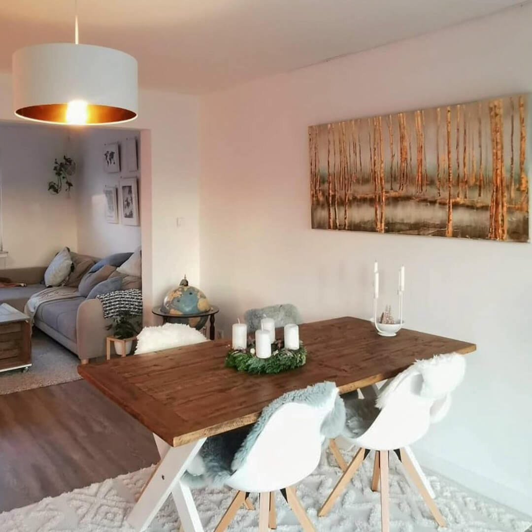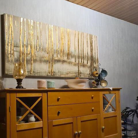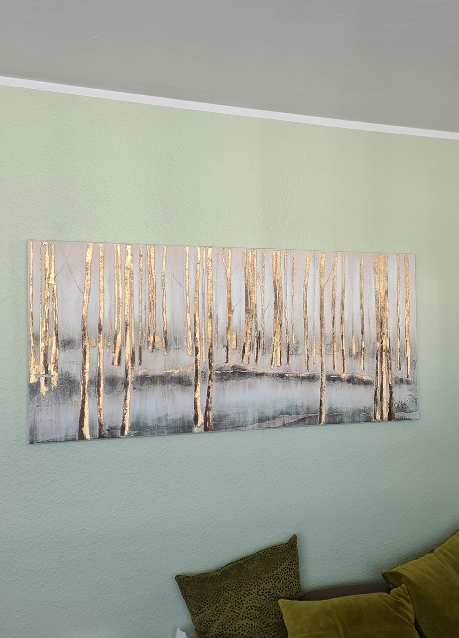 Auf dem mit Mixed-Media-Elementen und Goldglanz verzierten Ölgemälde eröffnet sich in verschiedenen Grau- und Brauntönen ein 'Mystischer Wald'. Unzählige Baumstämme reihen sich aneinander und verleihen dem kahlen Forst eine geheimnisvolle Ausstrahlung. Verschönern Sie Ihr Esszimmer mit einem spannenden Wintermotiv voller Ruhe und Stil. Ihr handgemaltes Gemälde erhalten Sie in der Größe 150x70cm. Anders als bei minderwertigen Drucken auf Leinwand können Sie auf unseren Unikaten jeden Pinselstrich fühlen. 0 Oil painting 1 Ölgemälde Handmade Quality 2 2