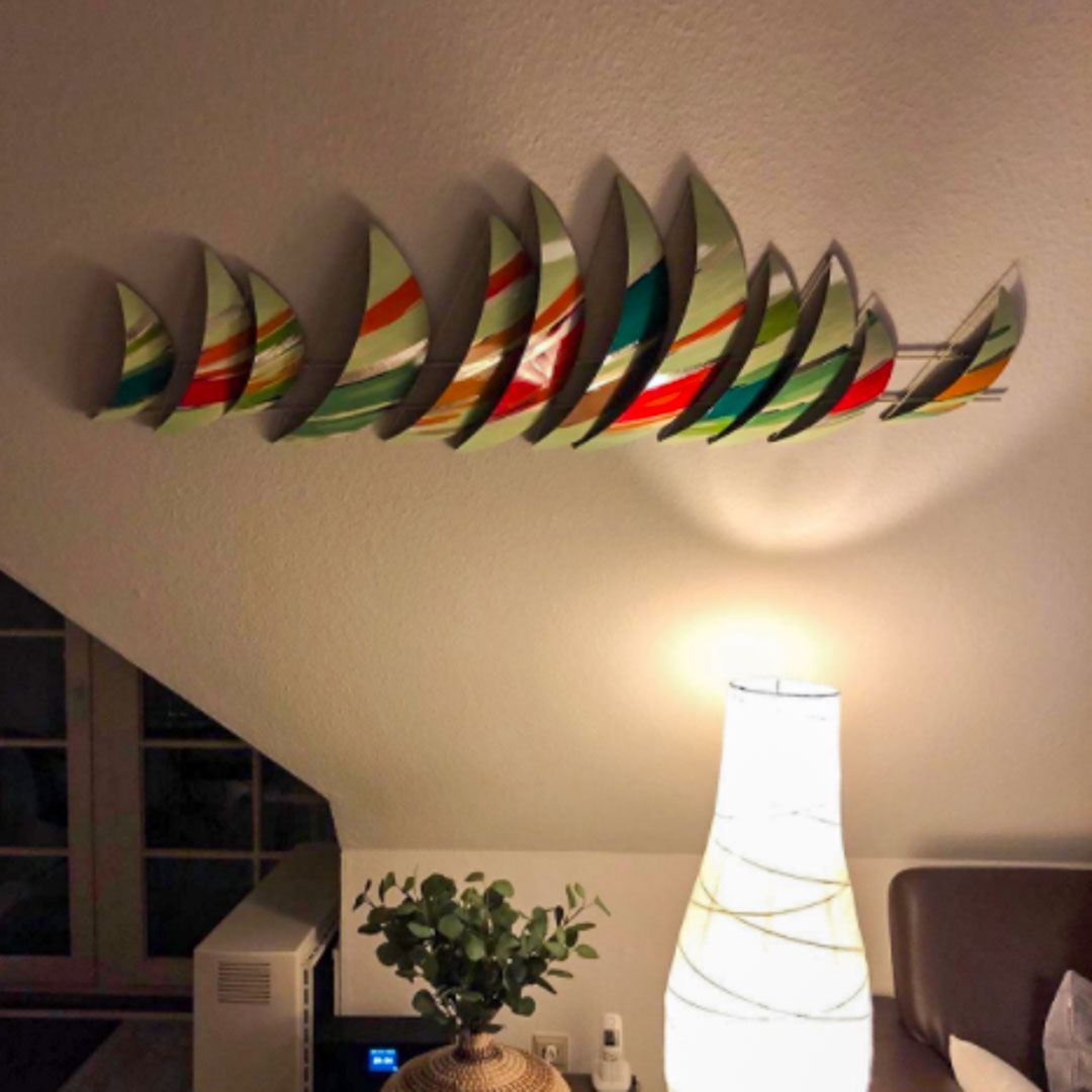 ¡Desplieguen las velas y las amarras! La lujosa escultura de pared con sus numerosas velas de colores le recordará a la última vez que estuvo "En la costa" y le llevará al mar en una de estas tablas de windsurf. Con la sensación de la refrescante brisa marina en su piel, esta pintura de metal XXL hecha a mano crea una atmósfera de lujo y nostalgia perfecta para su casa de vacaciones.