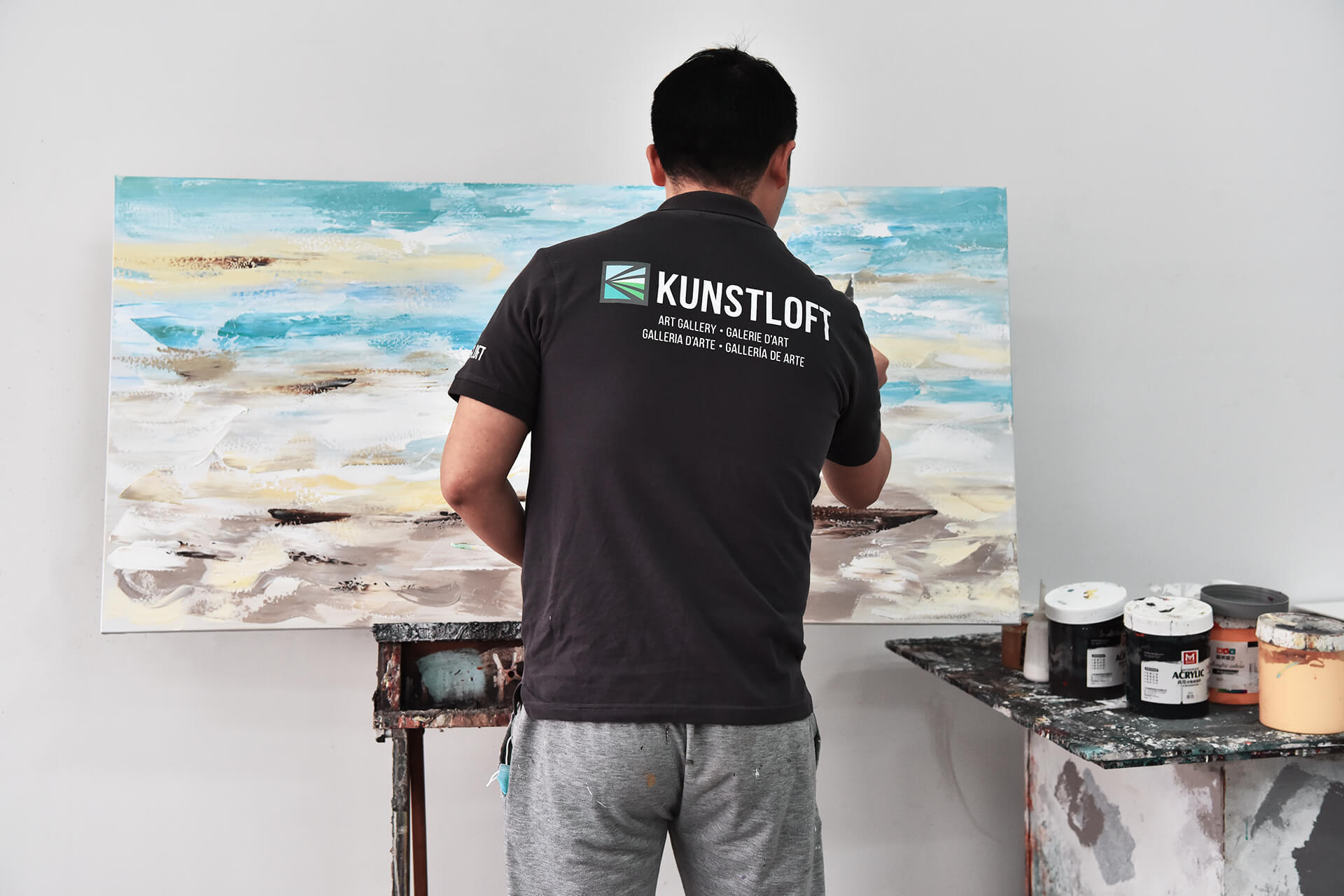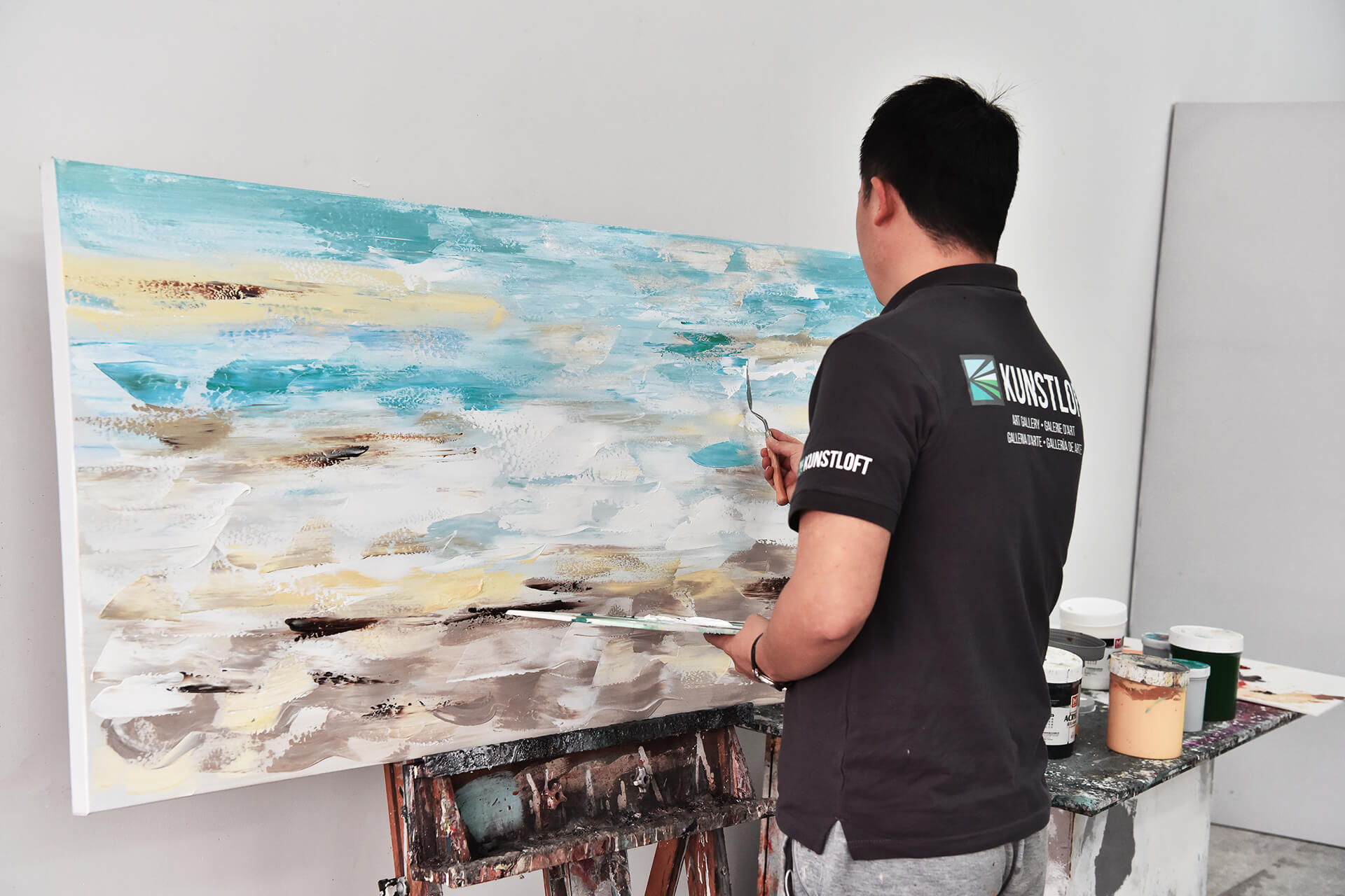 Ihr KunstLoft® Gemälde erhalten Sie in der Größe 140x70cm. Wir verwenden kraftvolle Acrylfarben und Leinwände in Profiqualität. Sie sind geruchslos und gesundheitlich absolut unbedenklich. Anders als bei minderwertigen Drucken auf Leinwand können Sie auf unseren Unikaten jeden Pinselstrich fühlen. Ihr Acrylbild können Sie sofort aufhängen, da ein praktisches Aufhängesystem angebracht ist. Die Gemälde sind auf 3,5cm breiten Keilrahmen aus massivem schwedischen Tannenholz gespannt - auf billige, sich verbiegende MDF-Rahmen verzichten wir. Zur leichten Ausrichtung liefern wir eine kleine Wasserwaage mit.